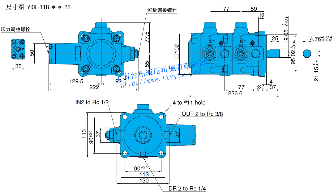 壓力Mpa最低 最高 VDR-11A(B)-1A2-1A2-22 30 1.5~3.5 30 1.5~3.5 14 800 1800 17 VDR-11A(B)-1A2-1A3-22 3~7 VDR-11A(B)-1A3-1A3-22 3~7 3~7 VDR-11A(B)-2A2-2A2-22 40 1.5~3.5 40 1.5~3.5 14 800 1800 17 VDR-11A(B)-2A2-2A3-22 3~7 VDR-11A(B)-2A3-2A3-22 3~7 3~7 備注:從設計數21更改為22號的設計代表了從3.2毫米寬的半月鍵變化為4.76毫米。