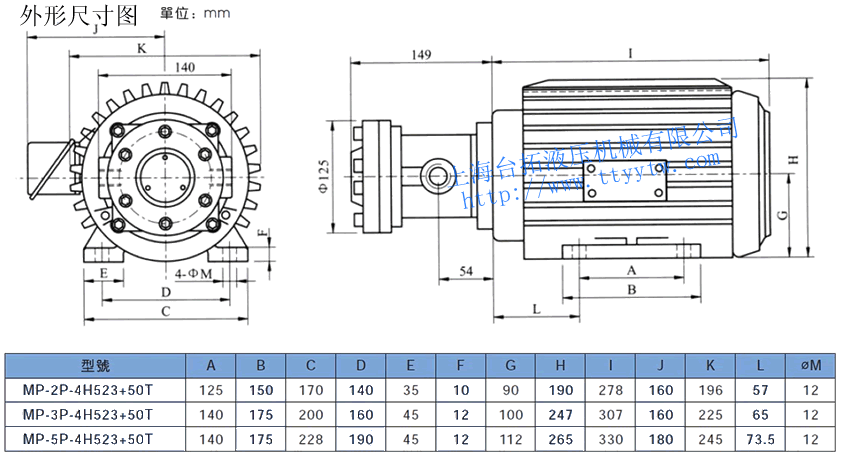型號 電機型式 功率 50T葉片泵型號 MP-2P-4H523+50T 2HP4P3 ? 380/50HZ 2HP 50T-12FR MP-3P-4H523+50T 3HP4P3 ? 380/50HZ 3HP 50T-20FR MP-5P-5H523+50T 5HP4P3 ? 380/50HZ 5HP 50T-36FR 定量葉片泵電機組合MP尺寸圖