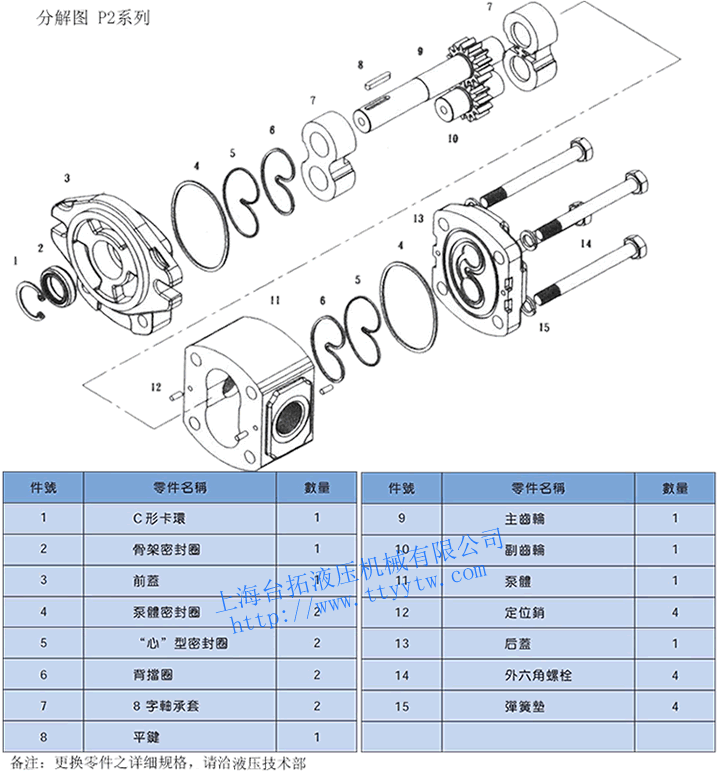 m?/rev外形尺寸(mm) 出入油口(PT) 重量(kg) 額定 最高 A B L 入口 出口 P204 21 25 4.00 47.90 48.95 97.70 3"/4 1"/2 2.32 P206 21 25 6.20 51.60 50.80 101.4 2.45 P208 22 25 8.40 55.10 52.55 104.9 2.55 P211 21 25 11.0 59.60 54.80 109.4 2.73 P214 21 25 14.3 65.10 57.55 114.9 2.82 P216 21 25 16.5 68.80 59.40 118.6 2.91 P219 21 25 19.2 73.10 61.55 122.9 3.14 P222 21 25 22.5 78.60 64.30 128.4 1" 3"/4 3.27 P225 18 21 25.0 83.10 66.55 132.9 3.36 P233 18 21 33.0 86.10 68.05 135.9 3.59 定量齒輪泵P2系列系列分解圖