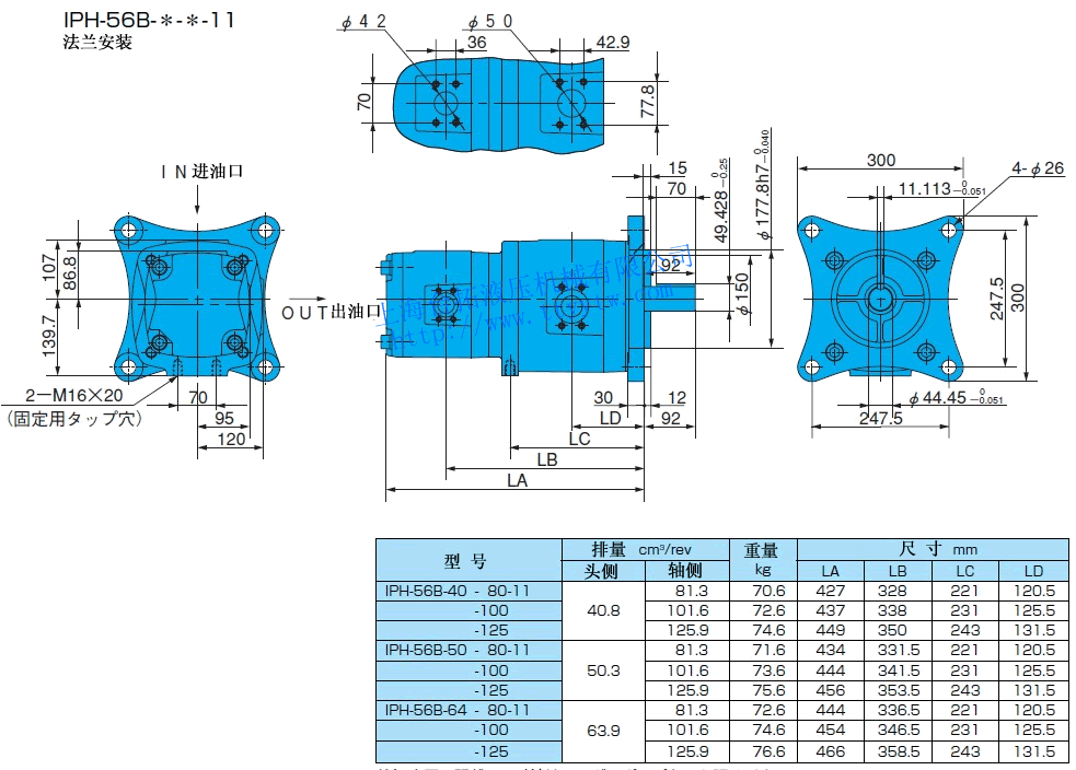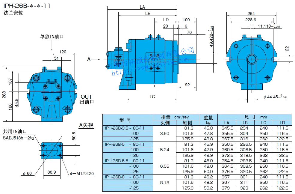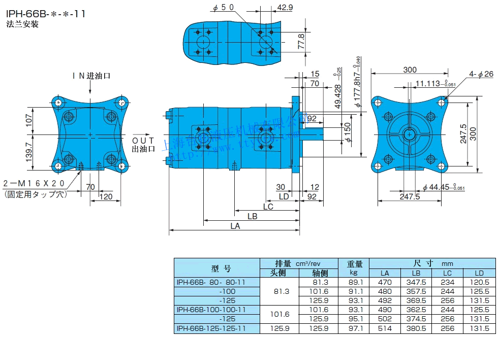 最高307.99 IPH-23B-*-*-(*)-11 12.2~18.9 11.6 IPH-24B-*-*-(*)-11 24.8~38.7 19.5 IPH-25B-*-*-(*)-11 48.9~76.6 34.5 IPH-26B-*-*-(*)-11 97.5~151.0 64.0 IPH-33B-*-*-(*)-11 12.2~18.9 12.2~18.9 15.3 IPH-34B-*-*-(*)-11 24.8~38.7 23.1 IPH-35B-*-*-(*)-11 48.9~76.6 38.1 IPH-36B-*-*-(*)-11 97.5~151.0 67.7 IPH-44B-*-*-(*)-11 24.8~38.7 24.8~38.7 500 31.0 IPH-45B-*-*-(*)-11 48.9~76.6 46.0 IPH-46B-*-*-(*)-11 97.5~151.0 75.6 IPH-55B-*-*-(*)-11 48.9~76.6 48.9~76.6 400 61.0 IPH-56B-*-*-(*)-11 97.5~151.0 90.6 IPH-66B-*-*-(*)-11 97.5~151.0 97.5~151.0 300 119.3 雙聯(lián)內(nèi)嚙合齒輪泵IPH尺寸圖