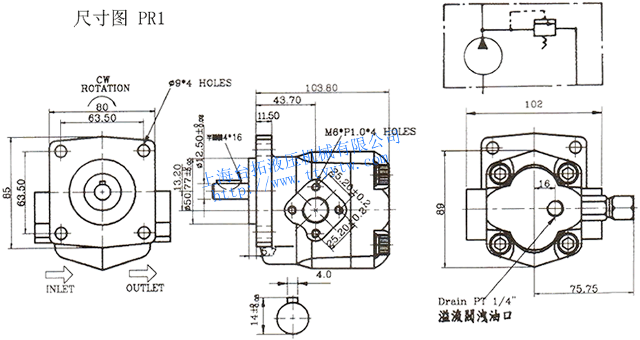 產品型號 吐出量cc/rev 壓力bar(psi) 轉速rpm 重量kg 工作 最高 速度 最大 最小 PR1-020 2 210(2500) 250(3000) 1800 5000 900 1.69 PR1-030 3 4000 850 1.70 PR1-040 4 4500 800 1.71 PR1-060 6 3500 700 1.72 PR1-075 7.5 3000 600 1.74 PR1-090 9 2500 550 1.74 PR1-105 10.5 2000 500 1.74 PR1-120 12 2000 500 1.76 齒輪泵附調壓閥PR1系列尺寸圖