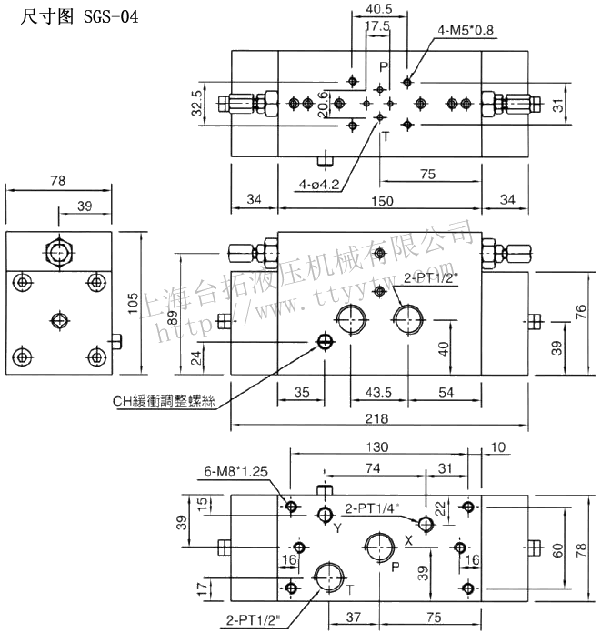 型號 最大流量?/min 最大壓力MPa 口徑 臺面 SGS-04 30 4 PT 1/2 " 300×600 電磁式引導方向閥SGS-04尺寸圖