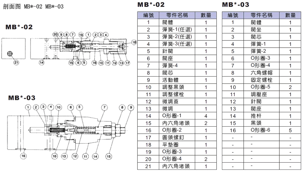 MB P -02 -B -M 系列號碼 控制油路 規格 壓力調整范圍 把手型式 疊加式