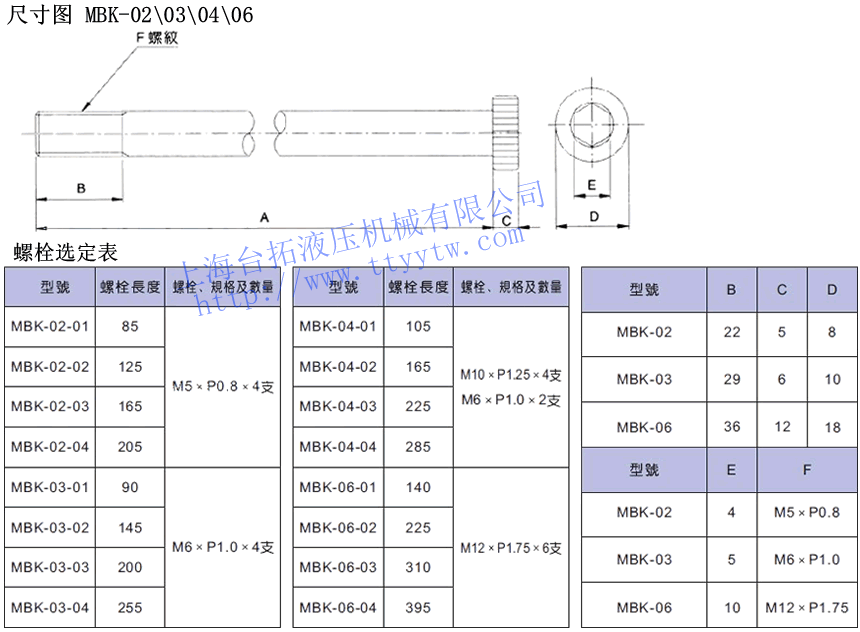 MBK -02 -1 系列號碼 規格 層數 疊加閥專用螺栓 02:1/4" 疊加閥用
