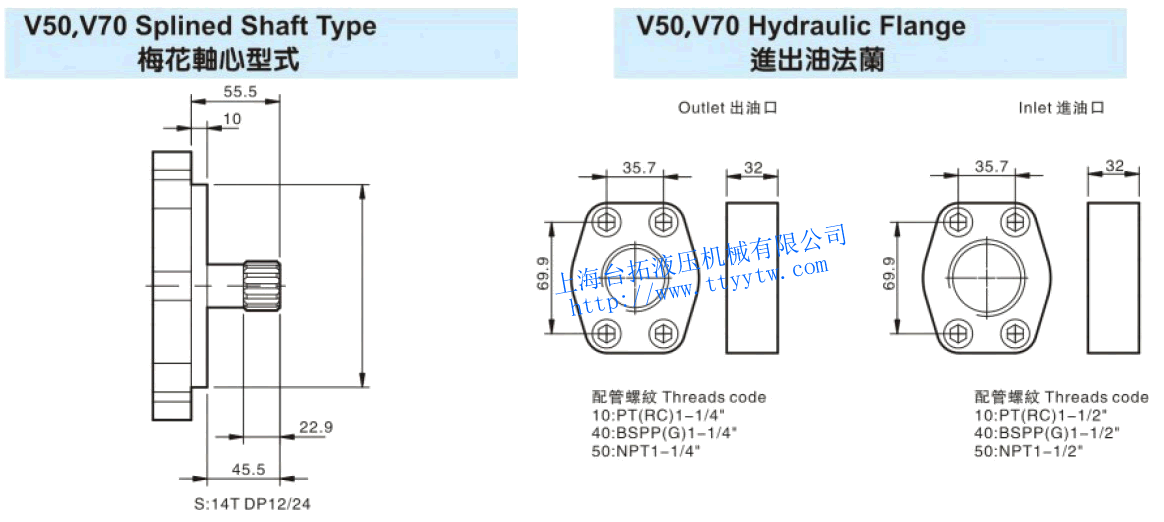 變量柱塞泵V15~V70梅花軸心型式及進出油法蘭尺寸圖