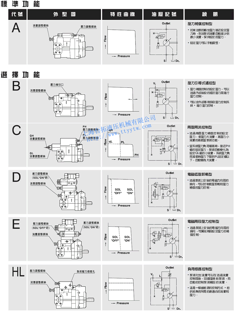 (kg)1000rpm 1200rpm 1500rpm 1800rpm 最大 最小 P08-A0-** 8.0 8.0 9.6 12.0 14.4 2~4 (20~40) 25(255) 2000 500 9 P08-A1-** 2~7 (20~73) P08-A2-** 3~14 (30~145) P08-A3-** 3~21 (30~215) P16-A0-** 16.5 16.5 19.8 24.7 29.7 2~4 (20~40) 25(255) 2000 500 12 P16-A1-** 2~7 (20~73) P16-A2-** 3~14 (30~145) P16-A3-** 3~21 (30~215) P22-A0-** 22.0 22.0 26.4 33.0 39.6 2~4 (20~40) 25(255) 2000 500 12 P22-A1-** 2~7 (20~73) P22-A2-** 3~14 (30~145) P22-A3-** 3~21 (30~215) P36-A0-** 36.0 36.0 43.2 54.0 64.8 2~4 (20~40) 25(255) 2000 500 23 P36-A1-** 2~7 (20~73) P36-A2-** 3~14 (30~145) P36-A3-** 3~21 (30~215) P46-A0-** 46.0 46.0 55.2 69.0 82.8 2~4 (20~40) 25(255) 2000 500 23 P46-A1-** 2~7 (20~73) P46-A2-** 3~14 (30~145) P46-A3-** 3~21 (30~215) P70-A1-** 70.0 70.0 84.0 105.0 126.0 2~7 (20~73) 28(286) 1800 500 41 P70-A3-** 3~21 (30~215) P70-A4-** 3~28 (30~286) P100-A1-** 100.0 100.0 120.0 150.0 180.0 2~7 (20~73) 28(286) 1800 500 60 P100-A3-** 3~21 (30~215) P100-A4-** 3~28 (30~286) 變量柱塞泵P08~P100控制方式