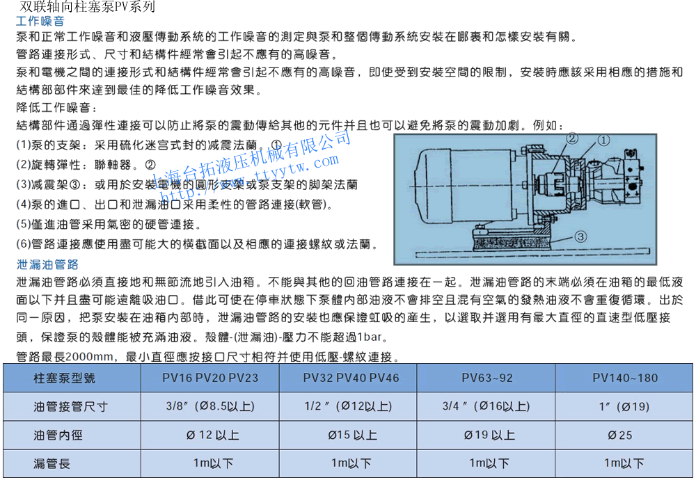 E:DC12V F:DC24V16/20/23+16/20/23 38 PV-40×16/20/23-** 40+16/20/23/40 49/60 PV-63/80/92×16/20/23 63/80/92+16/20/23 79 PV-63/80/92×40-** 63/80/92+40 90 PV-63/80/92×63/80/92 63/80/92+63/80/92 120 雙聯式軸向柱塞泵PV系列工作噪音及泄油管路